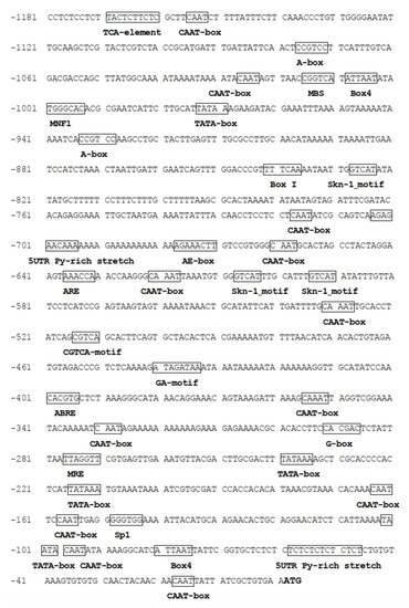 The promoter of PtAOS1 containing 1181 bp upstream of the start codon was isolated and analyzed. The promoter fragment typically comprised an element involved in MeJA responsiveness (CGTCA-motif), an abscisic acid responsiveness element (ABRE) and an MYB binding site (MBS) mentioned drought stress (Figure 3). Additionally, cis-acting elements in defense and stress responsiveness (TC-rich repeats) and element essentials for anaerobic induction (ARE) were found also. An element conferring a high transcript level (5UTR Py-rich stretch) was found at −70 to −60 bp upstream of the start codon which might play a vital role in gene expression. A number of light responsive elements existed in the PtAOS1 promoter such as AE-box, box4, BoxI, G-box, GA-motif, MNF1 and Sp1.