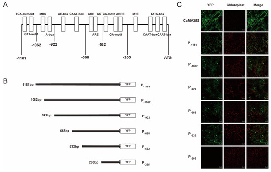 Transient expression assays were used to examine a core region in the PtAOS1 promoter. Promoter P−1181 (−1181 to +1) and its truncated fragments P−1062 (−1062 to +1), P−922 (−922 to +1), P−668 (−668 to +1), P−532 (−532 to +1) and P−265 (−265 to +1) were assigned to drive a yellow fluorescent protein (YFP) in tobacco leaves. A YFP signal driven by P−1182 was detected successfully in tobacco epidermal cells which illustrated the transcription activation of the PtAOS1 promoter. A YFP driven by P−1062, P−922, P−668 and P−532 fragments exposed a fluorescence signal equally with that using P−1182. However, a YFP signal with a P−265 fragment drive decreased sharply, implying a core function lost (Figure 4A–C).