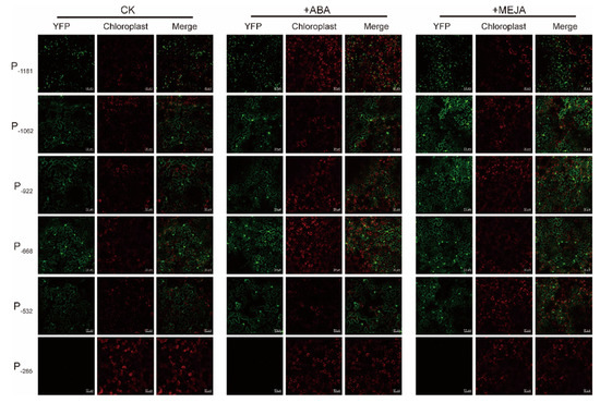 To demonstrate the responses of the PtAOS1 promoter to MeJA and abscisic acid (ABA), 50 µM MeJA and 25 µM ABA were applied on infiltrated tobacco leaves. Results showed YFP was stimulated significantly after MeJA and ABA treatments when most truncated promoters were used except only P−265 (Figure 5). No fluorescent signal was detected at all when a YFP was driven by P−265.