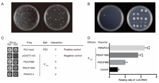The yeast one-hybrid screening system was employed to isolate proteins interacting with the PtAOS1 promoter. Basing on the core region of detection, P−532 was selected for bait vector construction. The minimal inhibitory concentration of Aureobasidin A (AbA) for the bait yeast strain was 300 ng/mL. After a screen in a cDNA library prepared using drought-treated trifoliate orange leaves, three clones exhibited AbA resistance on selective plates (Figure 6A,B). Sequencing for three clones suggested they were PtDUF886, PtDUF1685 and PtRAP2.4, respectively. One-to-one re-transformations for three proteins showed all of the three still grew normally on SD/-Leu medium with 300 ng/mL AbA (Figure 6C). To confirm the interactions, dual luciferase assays were performed additionally. Results suggested that PtDUF886, PtDUF1685 and PtRAP2.4 could enhance P−532 drive activity 2.1-, 3.6- and 4.5-folds higher, respectively, relative to the control (Figure 6D).