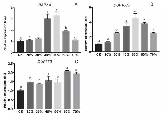 Expression pattern of PtRAP2.4 (A), PtDUF1685 (B) and PtDUF886 (C) under drought stress. Different letters above the columns indicate significant differences at p < 0.05. CK, control samples under well-watered condition.