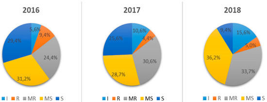 Figure 1. Diagram of distribution of spring wheat varieties by susceptibility to stem rust during 2016–2018.