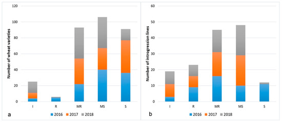 The comparison of the severity ratings of commercial varieties and introgression lines showed that the number of genotypes characterized by a resistant type of the reaction was significantly higher among ILs (Figure 2a,b). Thus, the immune and resistant (IT = 0/R) types of the reaction in all three years displayed 49% of ILs and only 15% of wheat cultivars and breeding lines.