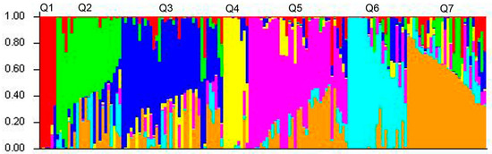 Four thousand eight hundred SNP markers covering all chromosomes of common wheat were used to determine the genetic population structure. Based on the results obtained using the STRUCRURE and ΔK statistics, there were seven postulated subclusters, including 6, 24, 35, 9, 35, 21 and 28 genotypes, respectively (Figure 3 and Table S2).