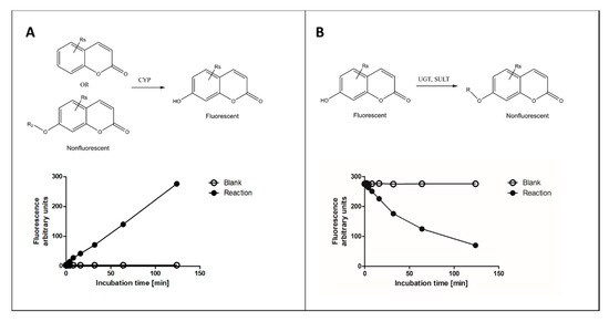 Figure 1. Principles of fluorescence-based cytochrome P450 (CYP) oxidation and conjugation assays with coumarin derivatives. In CYP oxidation, a nonfluorescent coumarin is oxidized to corresponding fluorescent 7-hydroxycoumarin (panel A), which can be conjugated to a nonfluorescent glucuronide or sulfate by uridine diphosphate glucuronosyltransferase (UGT) or sulfotransferase (SULT) enzymes, respectively (panel B). The activities of enzymes can be determined from fixed time (end-point) or continuous assay (kinetic) setups.