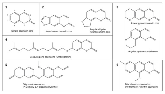 The coumarin (2H-1-benzopyran-2-one) scaffold is made of fused benzene and α-pyrone rings. Coumarins can be grouped in six types based on their extended backbone structures (Figure 2): (1) simple coumarins, (2) furanocoumarins, (3) pyranocoumarins, (4) sesquiterpenyl coumarins, (5) oligomeric coumarins and (6) miscellaneous coumarins [19]. The coumarin scaffold occurs in constituents of food and numerous natural and synthetic products such as drugs, perfumes, rodenticides, and laser dyes [19,20].