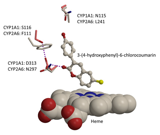 Figure 4. Size, shape, and electrostatic properties differ between CYP1 family enzymes and CYP2A6, affecting the binding preference of 3-phenyl coumarins, here a docked pose of 3-(4-hydroxyphenyl)-6-chlorocoumarin. In CYP2A6, Asn297 hydrogen bonds to the lactone group of coumarin derivative, while in CYP1 family enzymes (CYP1A1 shown here) there is a differently oriented aspartic acid at that sequence position. Furthermore, there are many other sequence differences that reflect into binding affinity and specificity, e.g., CYP2A6 has Leu241 vs CYP1A1 Asn115. Heme is shown as a cpk-model, bound substrate as ball-and-stick representation, amino acids as sticks (CYP1A1: pink carbon atom; CYP2A6: grey carbon atoms), and hydrogen bonds are shown as purple dotted lines.