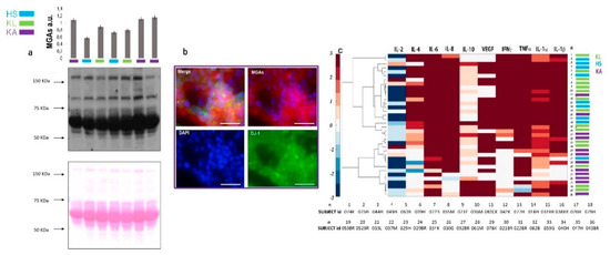 Secretome analysis. The top of the panel shows the histogram of the intensity rate with an error bar for each case analyzed for methylglyoxal adducts (MGAs) content by western blotting. In (a) the relative abundancy levels of MGAs in the secretomes of BDCs of healthy subjects, (HS in blue), localized (KL in green), and advanced cancer (KA in violet) cases. The relative amount of MGAs in the cell proteasoma has been normalized against the total protein load for each lane, stained with a Ponceau S dye and expressed as arbitrary units (au). (b) Immunofluorescence DJ-1 and MGAs in BDCs. Immunoreactivity is reported by a fluorescence light for DJ-1 (green) and for MGAs (red) in short-term BDCs from glioblastoma (required in violet), characterized by a prevalence of circulating tumour cells co-expressing DJ-1 and MGAs. Nuclei counterstain appears in blue fluorescence for DAPI incubation. (c) Hierarchical clustering based on Ward’s method grouped healthy subjects (HS) and patients with localized (KL) and advanced (KA) cancer in the function of each interleukins produced and presented in the correspondent BDCs secretome samples. Scale bars in panel (b) correspond to 50 µm.