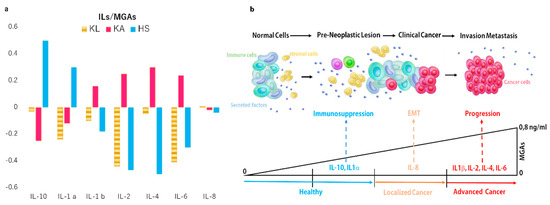 The analysis of correlation performed between the content of MGAs and specific interleukins secretion was performed to evaluate if the quality of cytokines production could be influenced by the progressive altered metabolism and consequent comprising oxidative balance registered with the progression of the disease. A negative correlation between MGAs and the secretion of some specific interleukins in the localized cancer cases, reverting in a positive correlation in the advanced cancer cases, was observed and reported in Figure 3a,b. Moreover, in the healthy secretome, a positive correlation was found in 10% of healthy samples between IL-10 and IL-1β. A negative correlation was found for the other cytokine investigated.