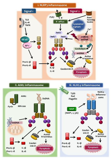 - Zhou, R.; Yazdi, A.S.; Menu, P.; Tschopp, J. A role for mitochondria in NLRP3 inflammasome activation. Nature 2011, 469, 221–225. [Google Scholar] [CrossRef] [PubMed]