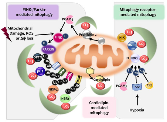 Mitophagy plays a key role in mitochondrial quality control and homeostasis. It is known that several different effectors participate in the process of mitophagy. These effectors include PINK1/Parkin with autophagic receptors, and multiple mitophagy receptors, such as NIP3-like protein X (NIX; also known as BNIP3L), BNIP3, FUN14 domain containing 1 (FUNDC1), FK506 Binding Protein 8 (FKBP8), and Syntaxin 17 (STX17) [12,83]. Also, Parkin-independent ubiquitin-mediated mitophagy and lipid-mediated mitophagy activation have been discovered [83,84,85,86] (Figure 2). Here, we briefly discuss several mechanisms underlying mitophagy processes, including Parkin/PINK1-induced and mitophagy receptor-mediated pathways.