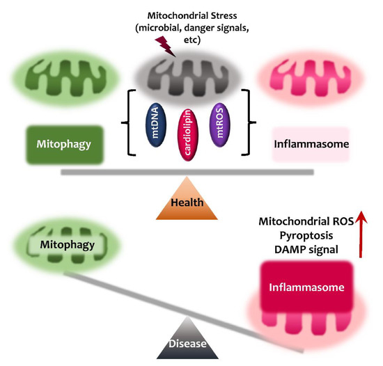 Although there is increasing evidence of the link between mitophagy and the inflammasome in human health and disease [1,17,121,122,123], few studies have reported the key components through which mitophagy regulates the inflammasome and vice versa. The interrelationship between inflammasome and mitophagy is summarized in Figure 3. The balanced activation of inflammasome-mitophagy pathway may contribute to protective host immunity and the prevention of harmful inflammatory responses, and thus maintain human health. However, dysregulation between inflammasome and mitophagy pathways may lead to pathological inflammatory responses to aggravate mitochondrial damage further, and pyroptotic cell death (Figure 3). In this section, we briefly discuss the molecular mechanisms by which inflammasomes and mitophagy are communicated.