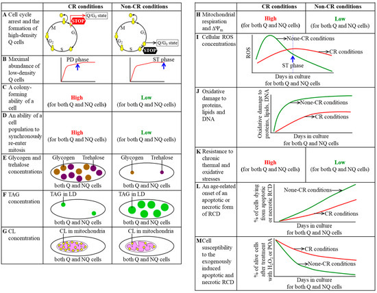 The caloric restriction (CR) diet alters an age-related chronology and specific traits of quiescent (Q) and non-quiescent (NQ) cell sub-populations. These aspects of an age-related chronology and these specific traits are named in different panels of the figure. They include the following: cell cycle arrest and the formation of high-density Q cells (A), maximal abundance of low-density Q cells (B), a colony-forming ability of a cell (C), an ability of a cell population to synchronously re-enter mitosis (D), glycogen and trehalose concentrations (E), triacylglycerol (TAG) concentration (F), cardiolipin (CL) concentration (G), mitochondrial respiration and the electrochemical potential across the inner mitochondrial membrane (ΔΨm) (H), cellular reactive oxygen species (ROS) concentrations (I), oxidative damage to proteins, lipids and DNA (J), resistance to chronic thermal and oxidative stresses (K), an age-related onset of an apoptotic or necrotic form of regulated cell death (RCD) (L) and cell susceptibility to the exogenously induced apoptotic and necrotic RCD (M). See the text for more details. Other abbreviations: CL, cardiolipins; LD, lipid droplets; POA, palmitoleic acid.