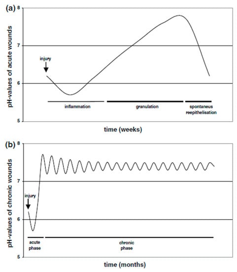 (a) Course of pH milieu in acute wounds. (b) Course of pH milieu in chronic wounds. Reprinted by permission from Springer Nature, Arch Dermatol Res, in [], Copyright (2006).