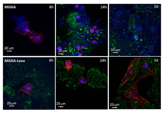In vitro competitive co-culture MC3T3-E1/S. aureus after 6 h, 24 h and 3 days of incubation onto MGHA and MGHA-Levo 3D scaffolds. Material refraction in green, preostoblastic nuclei and bacteria in blue (DAPI) and actin-fibrous of preosteoblast cytoplasm in red (phalloidin). Reprinted from reference [], Copyright (2018), with permission from Elsevier.