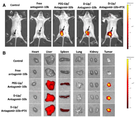 Representative in vivo (A) and ex vivo (B) images of 4T1 tumor-bearing BALB/C mice 24 h after injection of Cy5 labeled antagomir-10b-loaded liposomes. The black arrows in (A) indicated the location of tumors. Reprinted from [], Copyright (2015), with permission from Elsevier.