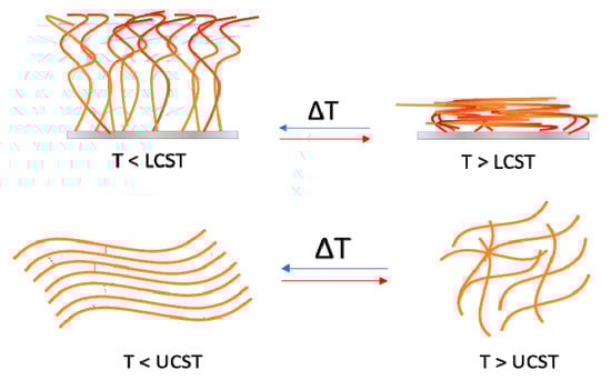 To generate magnetically responsive materials, magnetic nanoparticles can be incorporated into scaffolds for drug delivery, tissue regeneration, and artificial muscles. Through the application of a magnetic field, the nanoparticles are able to transmit a force to the surrounding material and/or cells triggering a response. Mechanical stimulation resulting from the deformation of the magnetic scaffold can lead, for example, to an increase in GAG expression and stimulate differentiation of stem cells to chondrocytes for cartilage repair, promote axonal extension and cell migration to guide neuronal regeneration or induce localized hyperthermia in cancer therapy []. In addition, light is an attractive source to trigger a response, as its intensity and wavelength can be controlled to impact specific areas of tissue. Light responsive moieties can then be incorporated into the structure of polymeric materials or molecules bearing light responsive groups can be introduced into a non-light responsive material to induce the release of pharmaceutical compounds or cause shape changes upon exposure to light []. Furthermore, thermoresponsive polymers that react to temperature enable the use of polymer networks for the release of drugs at specific temperatures []. These materials have been extensively reviewed [,], particularly thermoresponsive polymers with interesting lower critical solution temperature (LCST) and upper critical solution temperature (UCST) behaviors in water, the chemical and physicochemical characteristics, and their uses and applications as drug delivery systems, hydrogels, and surfaces for cell growth, among other biomedical applications []. Alternatively to the design, mechanism, and behavior of thermoresponsive materials and their combination with other features, namely pH-thermoresponsive or photothermoresponsive materials among others, and their applications in different fields of biomedicine [], and to complement the existing literature, in this review, we will focus on natural and synthetic thermoresponsive polymers and the results of their application in vitro and in vivo as biomedical materials.