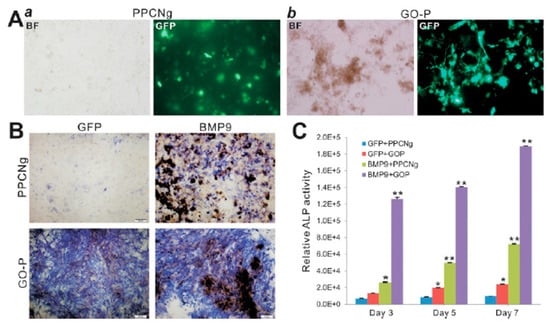 Osteoinductive and osteoconductive activities of the GO-P hybrid scaffold in vitro. (A) AdGFP or AdBMP9-infected iMADs were mixed with PPCNg (a) or GO-P (b) and examined at 48 h after infection under bright field (BF) or GFP fluorescence microscope (GFP). Representative images are shown. (B,C) ALP activity analysis. AdGFP or AdBMP9-transduced iMADs were mixed with PPCNg or GO-P and seeded in 24-well plates. ALP staining was carried out on day 5 (B), while quantitative ALP assay was conducted at 3, 5, and 7 days after infection (C). All assays were done in triplicate. * p < 0.05 and ** p < 0.01 when compared to respective GFP groups. Reproduced from []. Copyright © 2018 American Chemical Society.