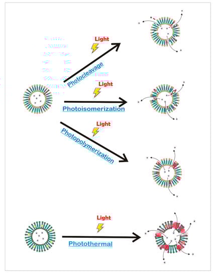 Photocleavage is another common approach that has been widely employed in light-induced drug delivery []. Photoreactions that involve photocleavage occur when a covalent bond is broken by light irradiation to facilitate the release of the encapsulate molecules []. In one case, drug molecules directly attached to a carrier by photocleavable linkers are released when the linkers are cleaved upon light irradiation. Otherwise, photoresponsive moieties are incorporated in the drug carrier and, after the light stimuli, the groups are cleaved, and the drug carrier is broken, causing the therapeutic content to be released. These systems usually use UV and high-energy visible light that have sufficient energy per photon to break covalent bonds. However, these short wavelengths suffer a serious drawback for in vivo application because they cannot penetrate deeply into most tissues due to light scattering and absorbance by intrinsic biological chromophores. Consequently, various strategies have been recently employed to replace UV and visible light with NIR light, which achieves greater tissue penetration [,].
