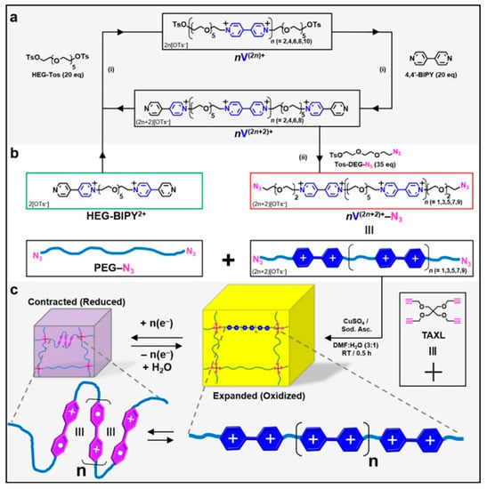 Viologens are dialkyl-4,4′- and 2,2′-bipyridiniums compounds which have an electroactive behavior and they have been used in the synthesis of artificial muscles. In their work, the driving force for network reorganization was the reduced electrostatic repulsion and exclusion of water and counteranions from the material after chemical reduction of the viologen subunits and formation of radical cations. They found that the degree and rate of actuation was markedly improved as more viologen subunits were present and that the process was reversible with a reduction of 9% of the original volume after a few hours []. The synthesis of such materials is shown in Figure 9.