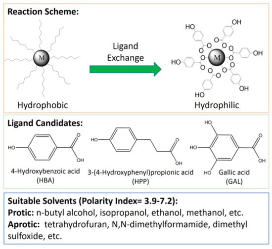 - Wang, X.; Tilley, R.D.; Watkins, J.J. Simple Ligand Exchange Reactions Enabling Excellent Dispersibility and Stability of Magnetic Nanoparticles in Polar Organic, Aromatic, and Protic Solvents. Langmuir 2014, 30, 1514–1521. [Google Scholar] [CrossRef]