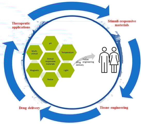 Stimuli-responsive materials have numerous applications in the biomedical field, from drug delivery systems to diagnostics and treatment. The delivery of drugs and genes requires the pharmaceutical compound or gene to reach the site of action at the right time and at an appropriate concentration, traversing obstacles like biological barriers, enzymatic or hydrolytic degradation, and solubility. More often than not, secondary effects arise from non-specific interactions with cells and tissues, so that vehicles that react to specific stimuli would be promising carriers for the targeted delivery of drugs and genes [,]. Tissue engineering also faces numerous challenges such as a paucity of renewable sources of functional cells that are immunologically compatible; a lack of suitable materials with the desired chemical composition, mechanical properties, and biological function; and an inability to generate large, vascularized tissues that can easily integrate into the circulatory system of the host with the inherently complexity of native tissues architecture, some of which can be addressed through the utilization of smart responsive biomaterials []. In this context, stimuli-responsive nanomaterials have received great attention. Significant progress has been made to tailor nanoparticles with stimuli-responsive properties, which have potential for future therapies for human or veterinary applications. Size, shape, and surface functionalization, as well as modifications, are necessary for active targeting or stimulus-responsive drug release [].