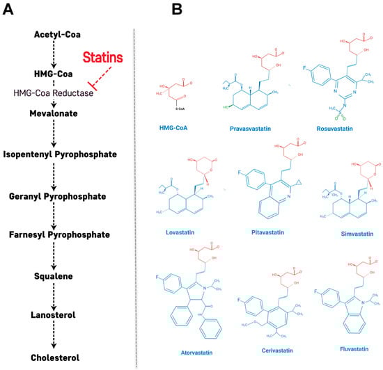 Statins are reversible and competitive inhibitors of HMG-CoA reductase, which is the rate-determining enzyme in the cholesterol biosynthetic pathway [24]. The HMG-like portion of statins, which is a modified 3,5-dihydroxyglutaric acid moiety, is structurally similar to HMG-CoA and causes the inhibition of HMG-CoA reduction reactions [25]. Through this mechanism, the mevalonate pathway is inhibited along with a consequent decrease in downstream products and cholesterol synthesis (Figure 1A). In addition, this statin-mediated decrease in intracellular cholesterol content leads to up-regulation of the LDL receptor (LDLR) in the liver and peripheral tissues, resulting in decreased blood LDL cholesterol (LDL-C) [26]. LDLR is the primary route by which LDL-C is removed from circulation, and its synthesis has been shown to be inversely correlated to the amount of cholesterol synthesized by a cell [27]. Through the action of statins, the cellular cholesterol concentration decreases, stimulating production of more LDLR and promoting LDL-C removal from the bloodstream, ultimately reducing CVD risk [27].