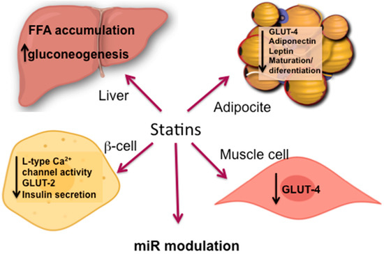 Statin therapy has been found to affect the expression of several miRs, which play a central role in the regulation of lipid and glucose metabolism [128] and that are associated with development of T2DM.