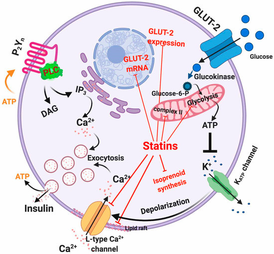 As described before, insulin is secreted by β-cells in response to glucose uptake through GLUT receptors (primarily GLUT-1 to 4), with GLUT-2 being the predominant isoform in β-cells [76,77]. GLUT-2 represents a high-affinity and low-capacity glucose transporter [78]. It has been shown that treatment of β-cells with atorvastatin and pravastatin inhibited GLUT-2 expression in a concentration-dependent manner [58]. However, rosuvastatin and pitavastatin showed a slight increase in GLUT-2 expression [58]. In addition to this, it has also been observed in mouse pancreatic β-cell line MIN6 cells that simvastatin treatment diminishes GLUT-2 mRNA and protein expression via a dose-dependent reduction of ATP production [79]. Another mechanism through which statins may interfere with glucose metabolism is the statin-mediated LDLR upregulation that increases cholesterol uptake in the β-cell leading to reduced mRNA and protein expression of GLUT-2, consequently limiting glucose uptake [19,80].