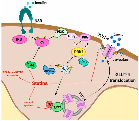 As described in Section 5.2.1, Section 5.2.2 and Section 5.2.3, GLUT-4 mediates insulin-stimulated glucose uptake [86] in a process that requires fusion of the transporter with the plasma membranes facilitated by IRS-1 and several kinases [86,170,171]. The small GTP-binding proteins are also key players in this process [22,86] and they require isoprenylation by mevalonate products for their association with the cell membranes. The statin-mediated inhibition of the synthesis of the above products increases insulin resistance in parallel with the mevalonate synthesis inhibitory capacity [21,172]. Furthermore, several other processes involved in the GLUT-4 signaling pathway may be inhibited by statins. These include IRS-1, insulin receptor β subunit, and Akt phosphorylation [22,166]. It has been suggested that these effects are relevant only for lipophilic statins (e.g., atorvastatin and simvastatin), but not for hydrophilic statins (e.g., pravastatin) [22,166]. The capacity of the former to enter adipocytes through passive diffusion can help explain this difference.