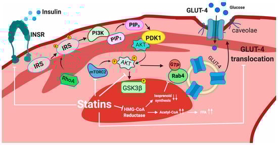 Skeletal muscle is the major tissue consuming most of the glucose that enters circulation [101], and any impairment in glucose uptake by this tissue may result in T2DM development. GLUT-4 mediates glucose transport into skeletal muscle cells, representing a key factor for blood sugar control [102]. As indicated above, insulin binding to INSR causes Akt activation [103] and translocation of GLUT-4 containing vesicles to the plasma membrane, thus facilitating the transport of glucose [104,105,106]. Although the mechanism of statin induced T2DM is not completely understood, there are both in vivo and in vitro studies that shed some light on this phenomenon in skeletal muscle. Some of the mechanisms that have been previously described are statin-mediated inhibition of insulin stimulated glucose uptake, impairment of intracellular signaling of the INSR and thereby of the Akt/mTOR pathway, or an excess of FFA accumulation in skeletal muscle as a consequence of HMG-CoA reductase inhibition.