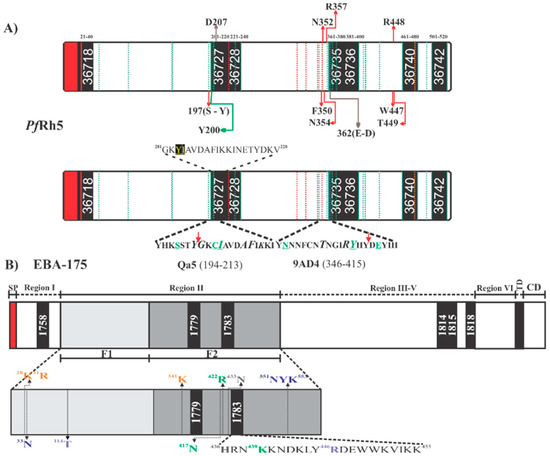 - Chen, E.; Salinas, N.D.; Huang, Y.; Ntumngia, F.; Plasencia, M.D.; Gross, M.L.; Adams, J.H.; Tolia, N.H. Broadly neutralizing epitopes in the Plasmodium vivax vaccine candidate Duffy Binding Protein. Proc. Natl. Acad. Sci. USA 2016, 113, 6277–6282. [Google Scholar] [CrossRef]