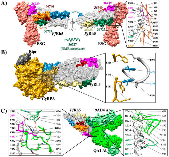 PfRh5 structure and its interactions (A) Structure of the interaction between PfRh5-BSG (PDB 4U0Q) [74], highlighting HABP binding to RBC: 36727 (green), 36728 (yellow), 36735 (orange), 36736 (blue), and 36740 (brown). HABP 36727 structure (green) determined by nuclear magnetic resonance (NMR), zooming in on residues in the interaction interface; pink shows HABP 36739 residues 448R, 449T, and 447W (close to HABP 36740), green HABP 36727 207D and yellow HABP 36735 362E; (B) Crystallographic structure of the Ripr, CyRPA and PfRh5 ternary complex in contact with the BSG receptor (PDB 6MPV) [76], zooming in on the residues belonging to the interaction interface between PfRh5-CyRPA, HABP 36736 aa 393L, and 397L shown in blue; (C) Rh5 crystallographic structure, showing points of contact with mAbs QA1 (PDB 4U1G) [74] and 9AD4 (PDB 4U0R) [74] highlighting HABP 36739 residues 451Q and 452K in pink and HABP residues 36727 205A, 209F, and 212K in green.