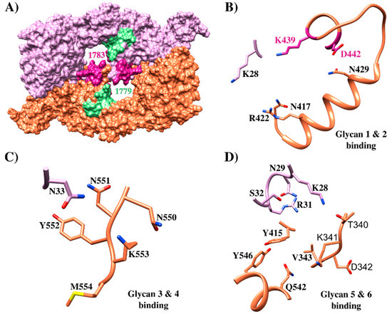 EBA-175 structure and its critical interactions. (A) Crystallographic structure of EBA-175 (PDB 1ZRL) [95] highlighting HABPs 1779 (green) and 1783 (pink); (B) glycan 1 and 2 binding sites to EBA-175, HABP 1783 439K and 442D residues contacting these glycans are highlighted in pink (PDB 1ZRO) [95]; (C) glycan 3 and 4 EBA-175 binding sites (PDB 1ZRO) [95] (D) glycan 5 and 6 EBA-175 binding (PDB 1ZRO) [95].