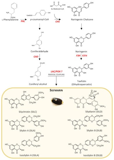 Partial scheme of the silymarin (SILM) flavonolignans biosynthesis pathway in S. marianum. Flavonolignans are mainly accumulated in mature achenes (yellow box). In red are presented genes potentially involved in this pathway: PAL (l-phenylalanine ammonia-lyase), CAD (cinnamyl alcohol dehydrogenase), CHS (chalcone synthase), flavanone 3-dioxygenase (F3H), flavone 3′-hydroxylase (F3’H), LAC (laccases) and POX (peroxidases). The dotted arrows indicate a single step, while dashed arrows indicate several steps in the metabolic pathway while the full arrows indicate direct synthesis of the compound through an enzyme.