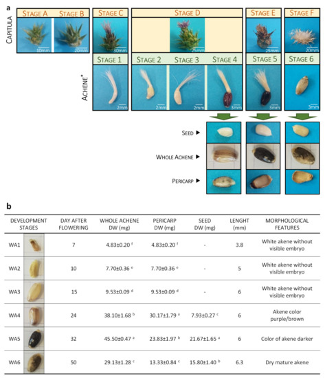 In the literature, in addition to the mature stage, three further stages of maturation have been described in terms of the appearance of capitula (i.e., early flowering, mid-flowering with dry flowers, late flowering with dry flowers and dehiscence of capitula) [25,26,27], corresponding here to fruit colors ranging from white / cream, purple to (dark) brown. If these stages allow for a general view of maturation, they do not allow for a precise characterization of achene development. Here, six different achene ripening stages were precisely defined (Figure 2), thus simplifying the sampling method and increasing the accuracy of the molecular and (bio)chemical analysis of the tissue.