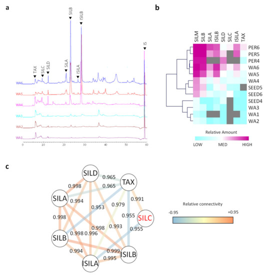 Accumulation of SILM compounds in S. marianum during achene development. (a) Chromatograms HPLC superposition of all 6 achene developmental stages showing the accumulation of SILM over time by comparison. IS: internal standard (6-methoxyflavone). (b) Extraction of compounds in whole achene (WA), pericarp (PER) and seed (SEED) represented in MeV (Multiple Experiment Viewer). Color scale is blue (weak content) to violet (high content) and grey color indicates not detected content. For quantitative values (referred to Table S1 expressed in mg/g DW). Values are means of n = 3 independent experiments; (c) the metabolite network was constructed using Cytoscape software 3.7, with a 0.95 cut-off value. Color edges from blue, yellow to red indicate increasing strength of the connection between the compounds.