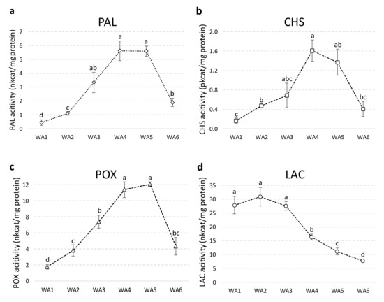 Time course evaluation during fruit development of specific phenylalanine ammonia-lyase (PAL) (a), chalcone synthase (CHS) (b), peroxidase (POX) (c) and laccase (LAC) (d) enzymatic activities in the soluble protein fraction from in whole achene of S. marianum. Values are the mean ± SD of 3 independent measurements. Different letters indicate significant differences at p < 0.05.