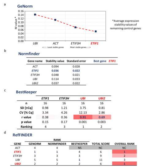 Gene expression stability analysis of the candidate reference genes for RT-qPCR gene expression study in S. marianum during fruit maturation according to GeNorm (a), NormFinder (b), BestKeeper (c) as well as RefFINDER ranking result (d). NS: not considered as stable enough by the software analysis. NC (Grey): not ranked. Figure 5c and d are represented as heatmap from white (lower stability) to pink (medium stability) and red (higher stability).