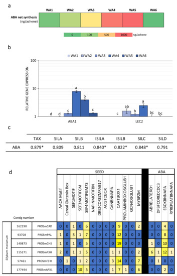 Linkage between compounds and ABA in whole achene stages. (a) Kinetics of abscisic acid (ABA) net production (expressed in ng/achene) at each developmental stage in whole achene (WA) during milk thistle fruit maturation (calculated from Table 1). (b) Relative quantification using RT-qPCR of RNA expression of 2 genes implicated in ABA flavonolignans biosynthesis (ABA1 and LEC2). (c) Pearson correlation of extraction compounds in whole achene stages were performed by PAST software. (* p < 0.05, n = 3). (d) Identification of ABA-responsive cis-acting elements located in gene promoter gene sequences (from blue to yellow indicating low to high number of each cis-acting element). Values are the mean ± SD of 3 independent measurements. Characteristics of cis-acting elements are provided in Table S5. Different letters indicate significant differences at p < 0.05.
