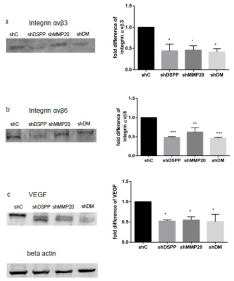 Studies of OSCCs have shown the upregulation of αvβ3 and αvβ6 in endothelial cells of intra tumoral vasculature and invasive tumor fronts, respectively [11,12]. We and others have reported the upregulation of VEGF in OSCCs [14] and the downregulation of VEGF in DSPP silenced cells [19]. To determine the effect of DSPP and MMP20 silencing in OSC2 cells on levels of αvβ3, αvβ6, and VEGF, Western blot analysis was performed on DSPP, MMP20, and DSPP-MMP20 silenced OSC2 cells. As shown in Figure 2, levels of αvβ3 and αvβ6 were significantly reduced (p < 0.05, 0.01, 0.001) following DSPP (shDSPP), MMP20 (shMMP20), and combined DSPP–MMP20 (shDM) silencing when compared to the controls. The αvβ3 level was decreased by 50% in shDSPP, 55% in shMMP20, and 45% in shDM cells (Figure 2a), whereas levels of αvβ6 were decreased by 48%, 38%, and 46% in shDSPP, shMMP20, and shDM, respectively (Figure 2b). Similarly, the VEGF levels were significantly decreased (p < 0.05) in shDSPP (48%), shMMP20 (46%), and shDM (50%; Figure 2c). These results suggest that DSPP and its cognate MMP20 partner may modulate the level of integrins αvβ3 and αvβ6, and VEGF in OSCC.