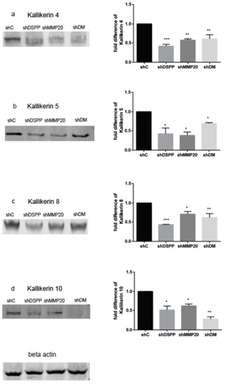 WB analysis of kallikreins levels in DSPP and MMP20 silenced OSC2 cells. (a) Downregulation of KLK4 in shDSPP (60%), shMMP20 (40%), and shDM (43%) were significant (p < 0.001, 0.01) compared to the control. (b) Downregulation of KLK5 in shDSPP (66%), shMMP20 (73%), and shDM (35%) were significant (p < 0.05) compared to the control. (c) Downregulation of KLK8 in shDSPP (53%), shMMP20 (35%), and shDM (47%) were significant (p < 0.001, 0.05, 0.01) when compared to the control. (d) Downregulation of KLK10 in shDSPP (48%), shMMP20 (37%), and shDM (73%) were significant (p < 0.05, 0.01) when compared with the control. Beta actin was used as the internal control. Values are given as mean ± SE for 3 independent experiments. shC = Scrambled Control; shDSPP = DSPP Silenced OSC2 cells; shMMP20 = MMP20 Silenced OSC2 cells; DM = Combined DSPP–MMP20 Silenced OSC2 cells; *p < 0.05; ** p < 0.01; *** p < 0.001.