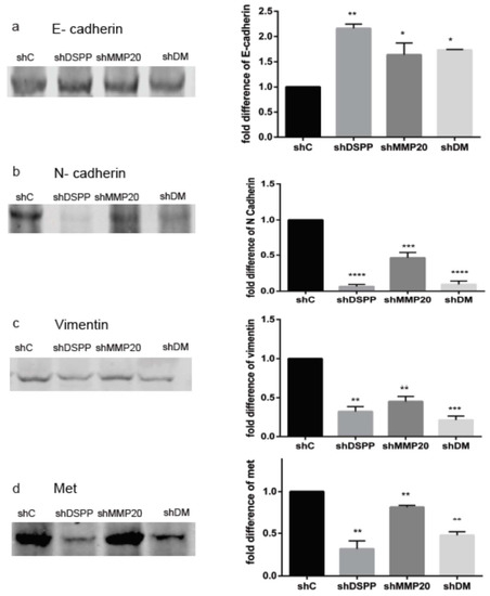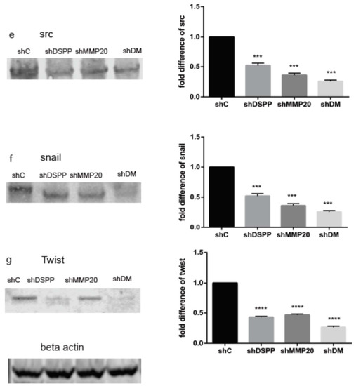 Furthermore, the expression of met (Figure 4d) decreased by 80% in the shDSPP cells, and by 30% and 47% for shMMP20 and shDM, respectively (p < 0.05). Src levels (Figure 4e) decreased by 60% in the shDSPP, 75% in shMMP20, and 85% in shDM (p < 0.001), whereas levels of snail (Figure 4f) decreased by 46%, 60%, and 74% in the shDSPP, shMMP-20 and shDM cells, respectively (p < 0.001). The levels of twist (Figure 4g) decreased by 44% in the shDSPP cells, 50% in shMMP20 cells, and by 70% in the shDM cells (p < 0.001).