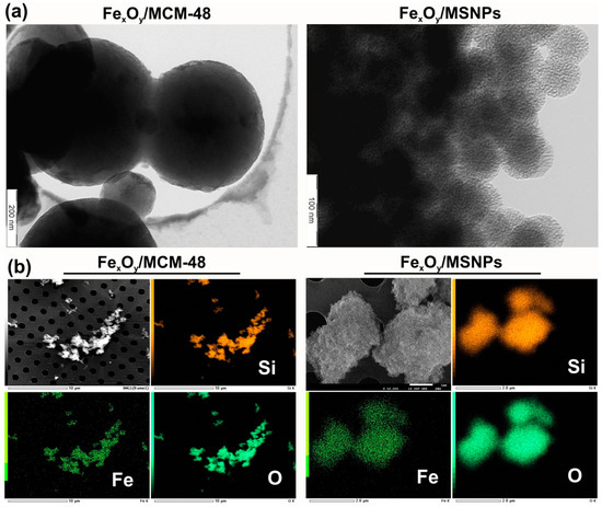 Visualization of produced NPs: (a) TEM images of FexOy/MCM-48 and FexOy/MSNPs catalysts obtained by dry impregnation; (b) SEM-EDX mapping of Si, Fe, O elements in the FexOy/MCM-48 and FexOy/MSNPs samples.