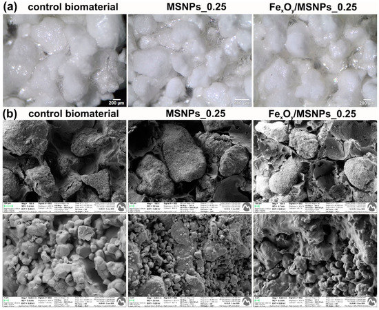 Visualization of the produced MSNPs-loaded scaffolds: (a) stereoscopic microscope images of the materials; (b) SEM micrographs of the scaffolds (upper images—magn. 100×, lower images—magn. 10000× for control and 5000× for NPs-loaded biomaterials).