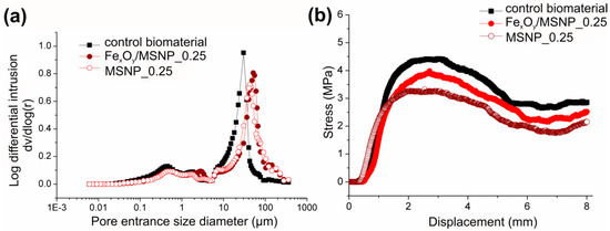 Basic characteristics of NPs-loaded biomaterial: (a) pore size distribution of the three different materials as determined by MIP; (b) stress–strain curves obtained with compression testing for the control biomaterial and scaffolds loaded with NPs and FexOy/NPs.