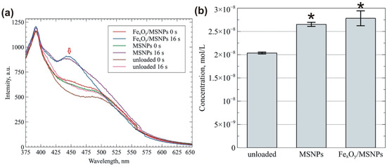 Plasma-induced OH production by biomaterials: (a) emission intensities of tested scaffolds (an arrow indicates emission peak of umbelliferone); (b) umbelliferone concentrations in HBSS solutions after 16 s GAD plasma treatment (* significantly different results compared to the control biomaterial (unloaded), according to One-way Anova followed by Tukey’s test, p < 0.05).
