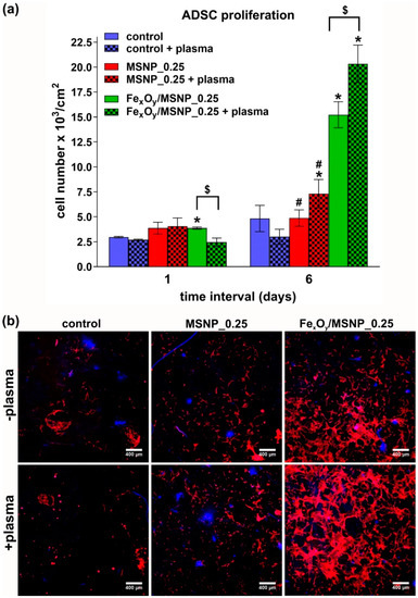 Proliferation of ADSCs on the surface of the NPs-loaded scaffolds upon nitrogen plasma exposure (16 s in HBSS; cells left in HBSS for 3 h after plasma treatment): (a) cell number increase with time determined by nuclei counting (control—biomaterial without any NPs; 0.25—concentration (wt.%) of NPs within the structure of the biomaterial; * statistically significant results compared to the corresponding (with or without plasma activation) control biomaterial, # compared to the corresponding (with or without plasma activation) biomaterial containing FexOy/MSNPs; $ statistically significant results between plasma-treated and untreated biomaterials, according to One-way Anova followed by Tukey’s test, p < 0.05); (b) CLSM images of ADSCs on the surface of the biomaterials (cells at extremely low concentration were seeded) 6 days after plasma treatment upon fluorescent staining of cytoskeleton and nuclei (red fluorescence—cytoskeleton, blue fluorescence—nuclei, magn. 40×).