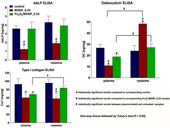 Osteogenic differentiation of ADSCs cultured on the plasma-activated scaffolds was determined by detection of typical markers of bone formation process: bone alkaline phosphatase (bALP), type I collagen (Col I), and osteocalcin (OC). The experiment revealed that incorporation of MSNPs into the biomaterial structure significantly inhibited bALP production by ADSCs regardless of plasma activation (Figure 8). However, addition of FexOy overcame this negative effect of pure MSNPs, thus stem cells grown on the FexOy/MSNPs-loaded scaffold showed similar bALP level to control samples. Col I synthesis by ADSCs was significantly reduced in the presence of both MSNPs and FexOy/MSNPs compared to the control biomaterial. However, this effect was slightly overcome by plasma activation of the FexOy/MSNPs-loaded scaffold, whereas plasma treatment of MSNPs-loaded biomaterial did not influence Col I production. Similarly, OC production was significantly decreased by both MSNPs- and FexOy/MSNPs-loaded biomaterials. In this case, plasma activation significantly increased OC synthesis by ADSCs on both mentioned biomaterials compared to untreated samples. Surprisingly, plasma treatment of FexOy/MSNPs-loaded biomaterial only overcame negative effect of the FexOy/MSNPs catalyst on the OC production, whereas plasma activation of MSNPs-loaded scaffold resulted in 5-fold increase in OC level compared to untreated MSNPs-loaded biomaterial and 2-fold increase compared to the control biomaterial (plasma-treated and untreated). Importantly, no statistically significant differences between plasma-treated and untreated control samples—with respect to bALP, Col I, and OC production—were observed.