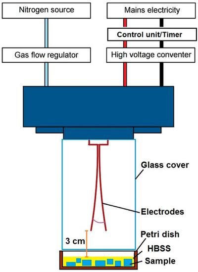 Atmospheric pressure plasma was generated in GAD reactor presented in Figure 9 developed at Lublin University of Technology (LUT), consisting of two copper electrodes (1.5 mm thick, and 10 cm long with 12° angle between them), which has been described in detail in other related publications [15,48]. The smallest inter-electrode distance was 3 mm. The AC high-voltage power supply was operated at 50 Hz frequency. Maximum apparent power was 52 VA and 25 VA on primary and secondary side of transformer, respectively. The RMS voltage and current on the secondary side ranged 688 V and 36 mA, respectively. Current/voltage waveforms may be seen in Supplementary Figure S3. The reactor was supplied with nitrogen as a substrate gas via gas flow regulator at flow rate of 7.33 dm3/min. The electrode tips were positioned at 3 cm distance from the surface of the liquid with immersed treated samples. Operation of power supply within selected treatment time of 16 s was controlled using control unit with timer designed at LUT. Measurements were performed in triplicates at room temperature and atmospheric pressure. The same conditions of plasma activation were applied in all cell culture tests.